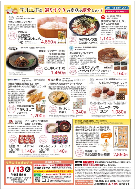 プリーモ市場では、「令和7年産 近江米コシヒカリ」をはじめ、この季節にぴったりの「甘酒・おしるこ」や「ハッシュドビーフ」、「富山のおかき」など、常温商品9点を取り揃えております。また、「高山寺公認 鳥獣戯画御朱印帳」もご用意しております。ぜひこの機会にお見逃しなく、お買い物をお楽しみください。