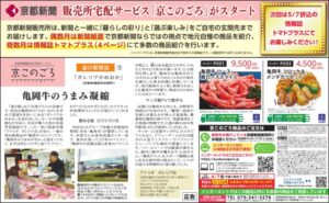 京都新聞販売所は、新聞と一緒に「暮らしの彩り」と「選ぶ楽しみ」をご自宅の玄関先までお届けします。偶数月は新聞紙面で京都新聞ならではの視点で地元自慢の商品を紹介、奇数月は情報誌トマトプラス(4ページ)にて多数の商品紹介を行います。
