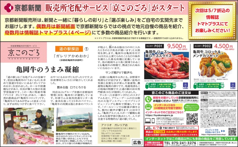 「京このごろ」WEBサイトでは、新聞紙面で紹介されている「亀岡牛」の2商品以外に春を感じる季節商品として「たけのこの佃煮」や「里の味(山ぶき・梅きくらげ 佃煮 2種セット)」、日用品として「ティシュー」や「トイレットペーパー」など、多彩な商品をご用意しております。